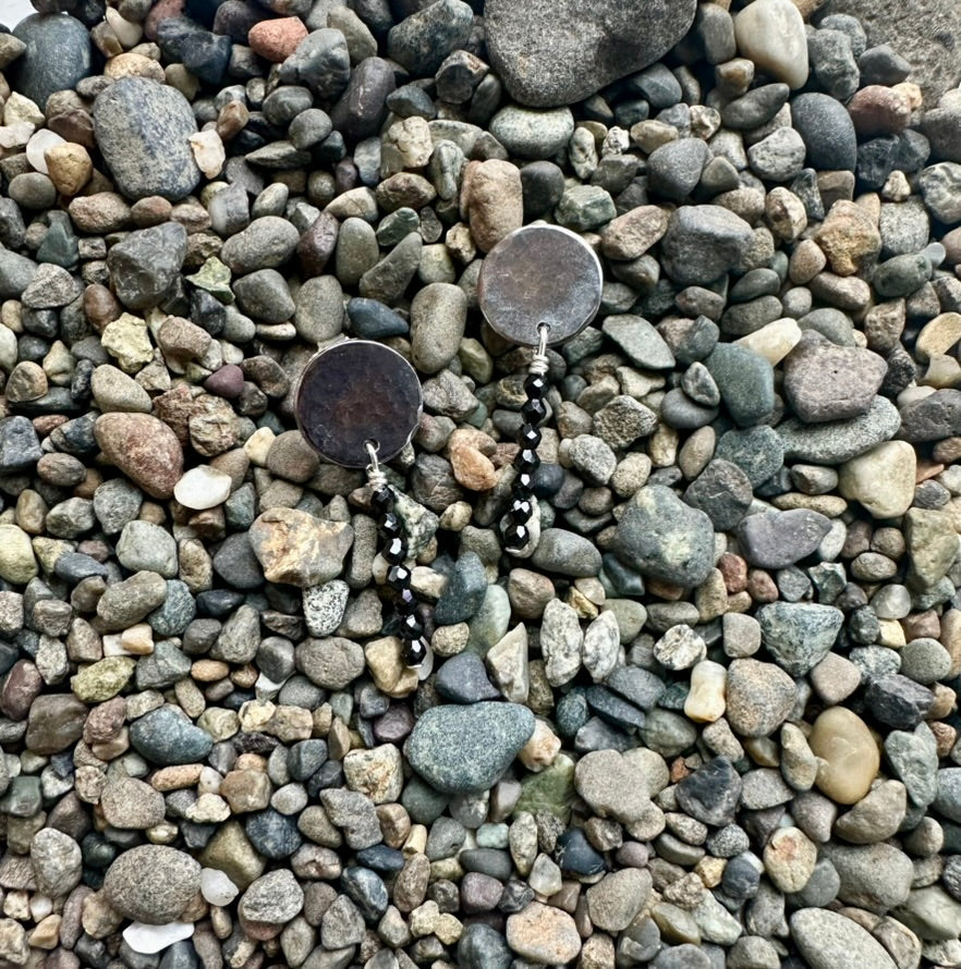 Embrace celestial elegance with these one-of-a-kind Dark Side of the Moon earrings. Handcrafted from oxidized sterling silver, these feature a handmade round and post back with a striking natural black Spinel drop that catches light like a shooting star. The hammered finish adds organic movement and depth, while the secure post friction back ensures comfortable all-day wear. At just one inch long, these artisan earrings deliver bold sophistication without overwhelming your features. Own a truly unique pair, signed.