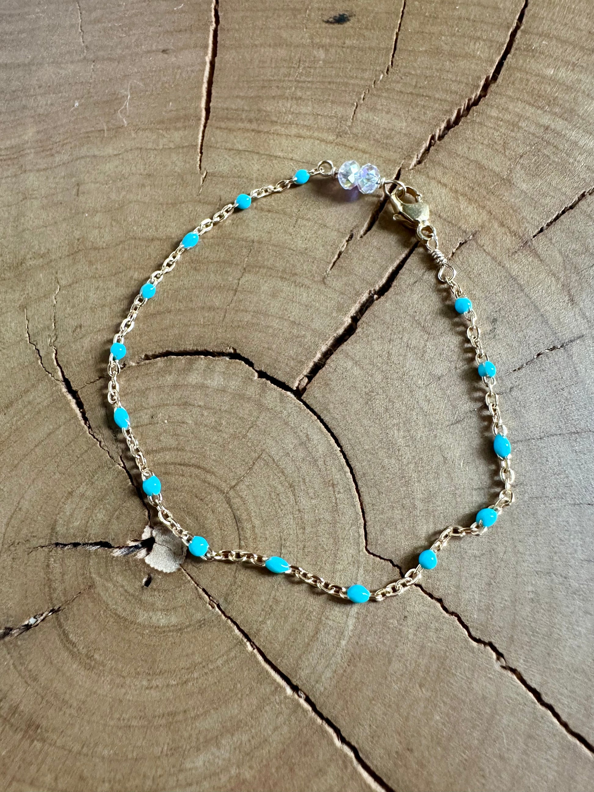 Oh so sweet this little layer of warm 14k gold fill and little pops of turquoise color. Accented with that Austrian crystal and easy to wear all the time whether you are on the run or on a run! (10k tested). Layered or alone you will want one for you and ALL the girls in your life. Choose your size.